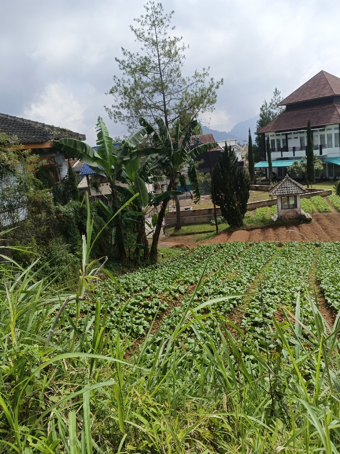 The image displays an outdoor scene in Buyantashi, Zambia, featuring a mix of cultivated land and residential structures under a partly cloudy sky. The foreground is filled with dense, unkempt green grasses and various leafy plants. Beyond this, a large field occupies the midground, consisting of numerous small, uniformly planted green leafy crops arranged in parallel rows within reddish-brown soil. To the left of the field, several banana trees with large green leaves are visible. To the right, a small, light-colored, square structure with a dark, peaked roof stands within a manicured lawn area. In the background, a prominent multi-story building with white walls and a distinctive reddish-brown, multi-tiered, pagoda-style roof is situated on the right, featuring multiple windows and a light blue canopy section. Parts of other buildings with dark tiled roofs are discernible on the left. A tall, slender conifer tree stands centrally, rising above the other structures. Distant hills are visible on the horizon. No individuals are present, and no specific actions or interactions are depicted.