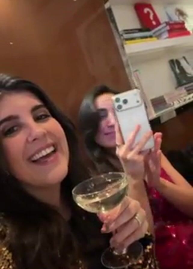 Two women are in an indoor setting with warm lighting. One woman is closer to the camera, wearing a sequined top, holding a stemmed glass filled with a light-colored liquid, smiling, and looking directly at the camera. The other woman is seated behind her, wearing a pink sequined dress, holding a white smartphone, and appearing to take a picture. Bookshelves are visible in the background, with a book bearing a red question mark at the top. The background wall is dark brown.