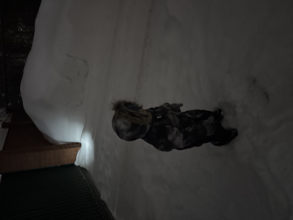 This image captures a nighttime scene in Ферма, Russia, heavily blanketed in snow. A young child, dressed in a dark, fur-hooded winter suit, stands centrally in the frame, facing towards the right side. The child's left arm is slightly extended forward. To the left, a dark green corrugated fence runs vertically, meeting a red brick wall or column. Adjacent to the brick structure, a large, irregularly shaped snowdrift rises several feet high, dominating the background. A focused beam of artificial light illuminates a patch of snow directly below the brick structure and at the base of the snowdrift. The entire visible ground surface is covered in fresh, undisturbed snow, indicating a cold, low-light environment.
