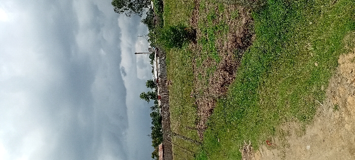 The image depicts an outdoor scene in Heni Village, Kenya, under an overcast sky. In the immediate foreground, a light brown dirt path occupies the left side, bordering a strip of green grass. Adjacent to the grass, a section of dark, cultivated earth with visible furrows extends across the lower-midground. Beyond this, a field of mixed green vegetation and exposed reddish-brown soil is visible, featuring a small, dense green tree positioned to the right of the frame's center. A rudimentary fence, constructed from upright wooden posts and horizontal elements, runs across the midground. In the background, a cluster of low-rise structures, likely residential or agricultural, with light-colored, possibly corrugated metal, roofs are visible, interspersed with various trees. A tall, dark communication tower or utility mast stands prominently above these structures on the right side of the frame. The sky is largely covered with dense, dark gray clouds, indicating an overcast weather condition. No human subjects are present.