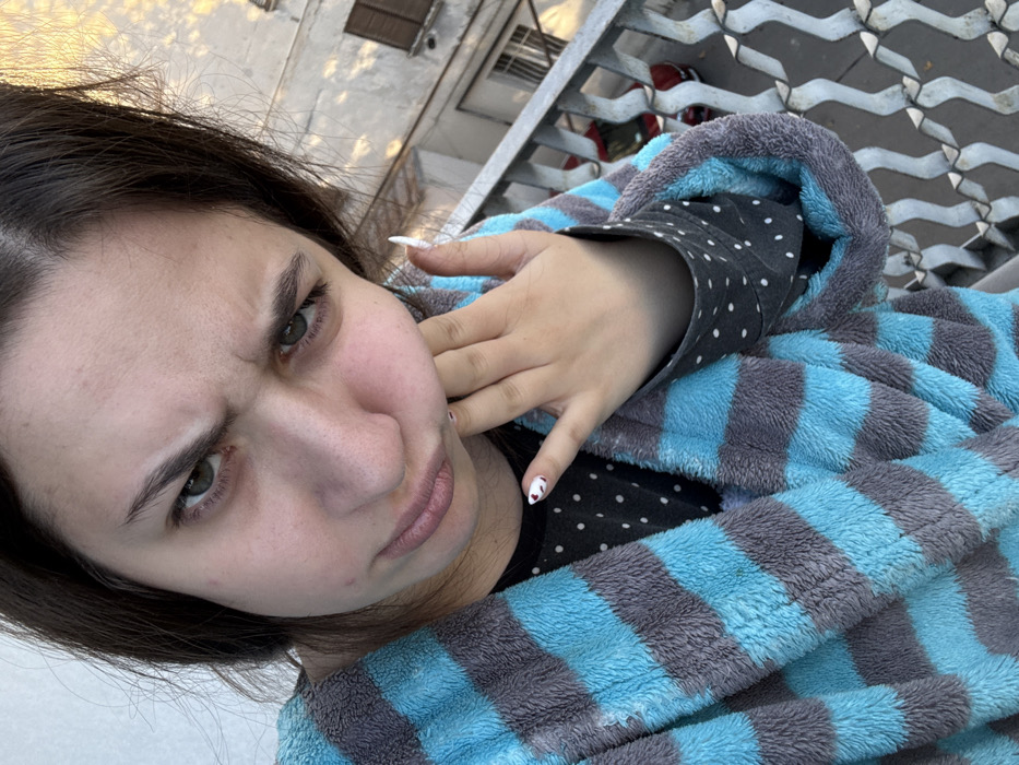 A young female individual with long dark hair, estimated to be in her late teens or early twenties, is depicted in a close-up, slightly high-angle shot. Her face displays a furrowed brow, downturned lips, and a direct gaze with green eyes, conveying an expression of displeasure or questioning. Her left hand is raised, with fingers curled and resting against her left cheek/jawline. Her fingernails are long, pointed, and white, with the ring finger featuring a small red heart design. She is wearing a plush robe with alternating horizontal stripes of light blue and dark grey. Beneath the robe, a dark-colored, long-sleeved shirt with white polka dots is visible. The background reveals an outdoor urban setting from a balcony perspective. A metal railing with a decorative, possibly wave-like or zig-zag pattern runs along the right side of the frame. Beyond the railing, an older building with light-colored plaster walls and dark window shutters is visible, illuminated by low-angle sunlight casting indistinct shadows. A portion of a red vehicle is discernible below the distant building. The architectural style of the background building and the overall urban residential environment are consistent with typical structures found within the city of Tbilisi, Georgia. The exact street or district cannot be determined from the visual information provided.