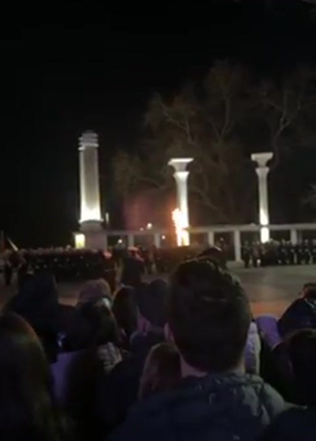 nighttime event in an outdoor plaza, where a crowd has gathered, many with their backs to the camera. In the distance, there is a row of uniformed personnel standing in formation. Behind them are three tall, illuminated columns. Between the center and right column, there is a fire burning. Above the crowd is some sort of metal scaffolding. Some indistinct audio is heard.