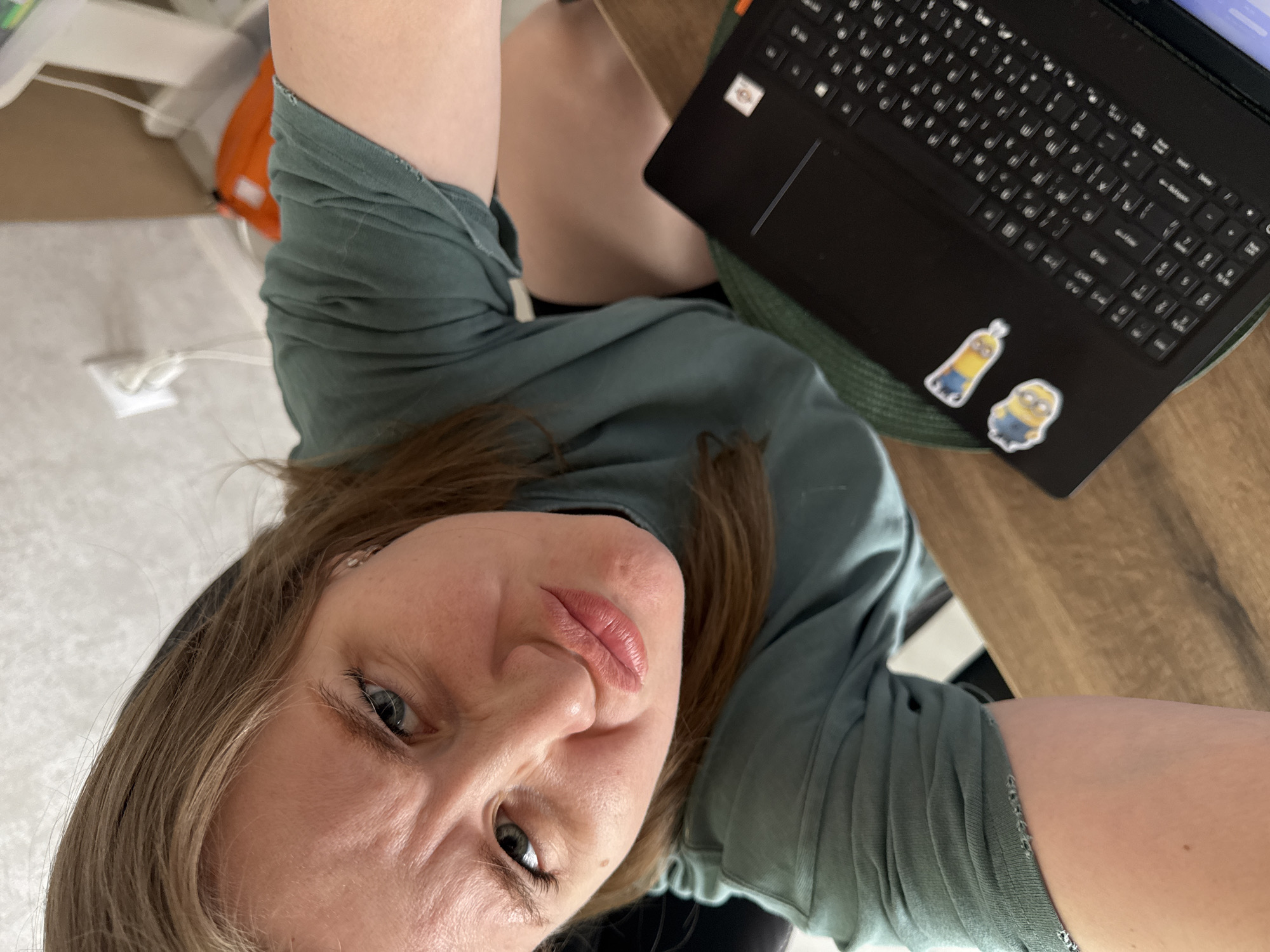 A woman is sitting at a desk with a laptop. The laptop has two Minions stickers on it. The woman is wearing a green t-shirt. The location is unspecified, but the request mentioned Gornyi (Dvurechenskoe S/P), Russia.