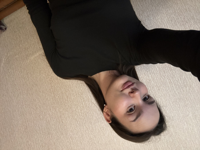 A self-portrait captures a female individual indoors in the city of Bayronovka, Russia. The subject, appearing to be a young adult, has a fair complexion, dark brown hair, and is wearing a black long-sleeved top. A small, clear stud earring is visible in her right ear. She displays a slight, closed-lip smile and maintains direct eye contact with the camera. The background features a light beige wall with a subtle vertical textured pattern. An indistinct dark object, possibly a piece of furniture, is partially visible in the lower right corner.