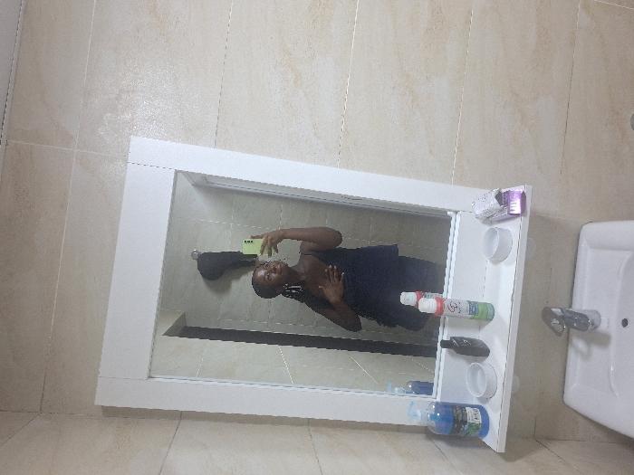 The image displays a modern bathroom interior. The precise location within Close, Nigeria, is not discernible from the visual evidence. A female individual, appearing to be of dark complexion with braided hair, is visible in the reflection of a large, white-framed mirror. She is wearing a dark, possibly navy, tank top and is actively taking a selfie using a light green smartphone held in her raised right hand. Her left hand rests on her chest, and she is smiling. The mirror features an integrated white shelf below the reflective surface. On this shelf, from left to right, are: a blue pump bottle of liquid, a black cylindrical bottle, a green and white aerosol can, two small white circular dishes or containers, and a small purple object wrapped in white material. Below the shelf and mirror is a white rectangular sink with a silver-colored faucet. The bathroom walls are covered in light beige or cream-colored tiles with visible horizontal grout lines. Reflected in the upper left portion of the mirror, a dark garment or object is seen hanging on a wall hook.