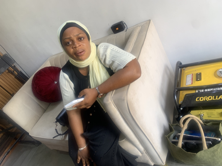 The image depicts an indoor scene in the city of Unknown, Unknown. A single adult female is seated on a light beige upholstered sofa, positioned towards the right of the frame, looking towards the viewer. She is wearing a black top, a long black skirt or dress, and a light yellow head covering, with light-colored, patterned sleeves. She holds a white mobile phone in her right hand; a wristwatch is visible on her right wrist, and a silver bracelet on her left. Behind her on the sofa, a black shoulder bag with a chain strap is visible, alongside a round, dark red velvet pillow with a central button. To the woman's right on the sofa, a small black portable electronic device is present. In the lower left foreground, a yellow portable generator with "COROLLA" emblazoned on its side is positioned next to a green canvas tote bag containing other items. The background consists of a plain light-colored wall and a ceiling appearing to be constructed from light wood panels, with indistinct dark equipment partially visible in the upper left.
