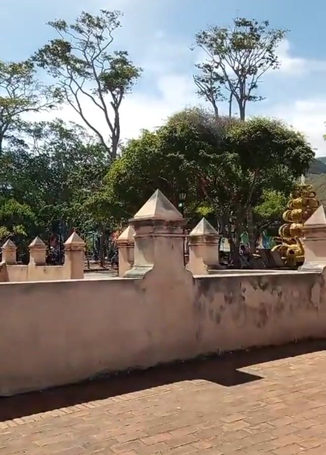The camera pans across a sunny outdoor plaza, revealing a low wall with pyramid-shaped pillars, trees, benches, and a few people