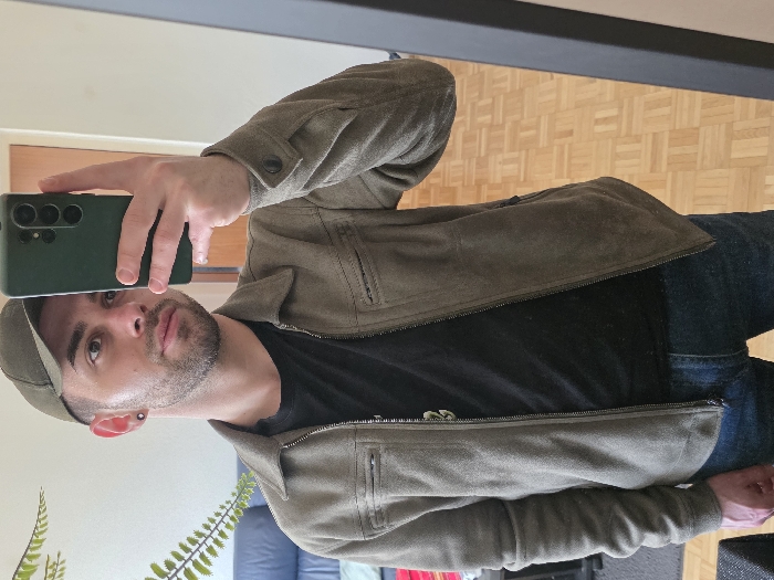 A male individual is depicted taking a mirror selfie in a residential interior in Salzburg, Austria. The subject, appearing to be in his 20s or 30s, has short dark hair, a trimmed beard, and a dark stud piercing in his left ear. He wears a dark olive green baseball cap, an unzipped olive green or khaki suede-like jacket over a black t-shirt, and blue jeans. He holds a dark green smartphone, featuring a visible triple camera array on its back, with his right hand to capture his reflection. The background behind him includes a light-colored wall, a light wood parquet floor, a partial view of dark blue furniture, and green plant foliage on the left side of the frame.