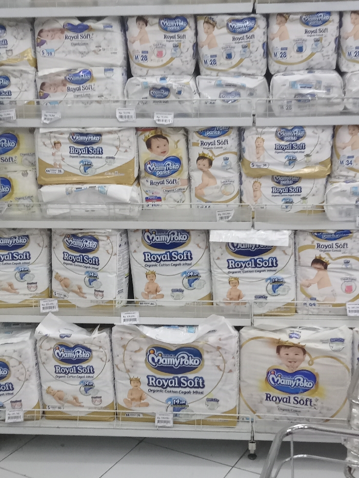 This image depicts an interior view of a retail establishment, likely a supermarket or minimarket, located in Nganjuk, Indonesia. The scene is dominated by multiple white metal shelves, extending from the top to the bottom of the frame, fully stocked with various packages of "MamyPoko Royal Soft" brand baby diapers. The shelves contain numerous identical packages arranged in rows and stacks. Product packaging is primarily white with blue and gold accents, featuring images of babies, some adorned with small crowns. Text on the packaging, visible in Indonesian, includes "Royal Soft," "Organic Cotton Cergah Iritasi" (Organic Cotton Prevents Irritation), and product sizes such as S 28, M 28, M 34, and 14 pcs. Price tags displaying values in Indonesian Rupiah (Rp), such as "Rp 19.350" and "Rp 179.279," are affixed to the front edge of several shelves beneath the corresponding products. The environment includes overhead artificial lighting, likely fluorescent, illuminating the display. The floor appears to be constructed of light-colored tiles with visible grout lines. A chrome-plated metal handle, characteristic of a shopping cart, is partially visible in the bottom right corner of the frame. No individuals are present in the scene.