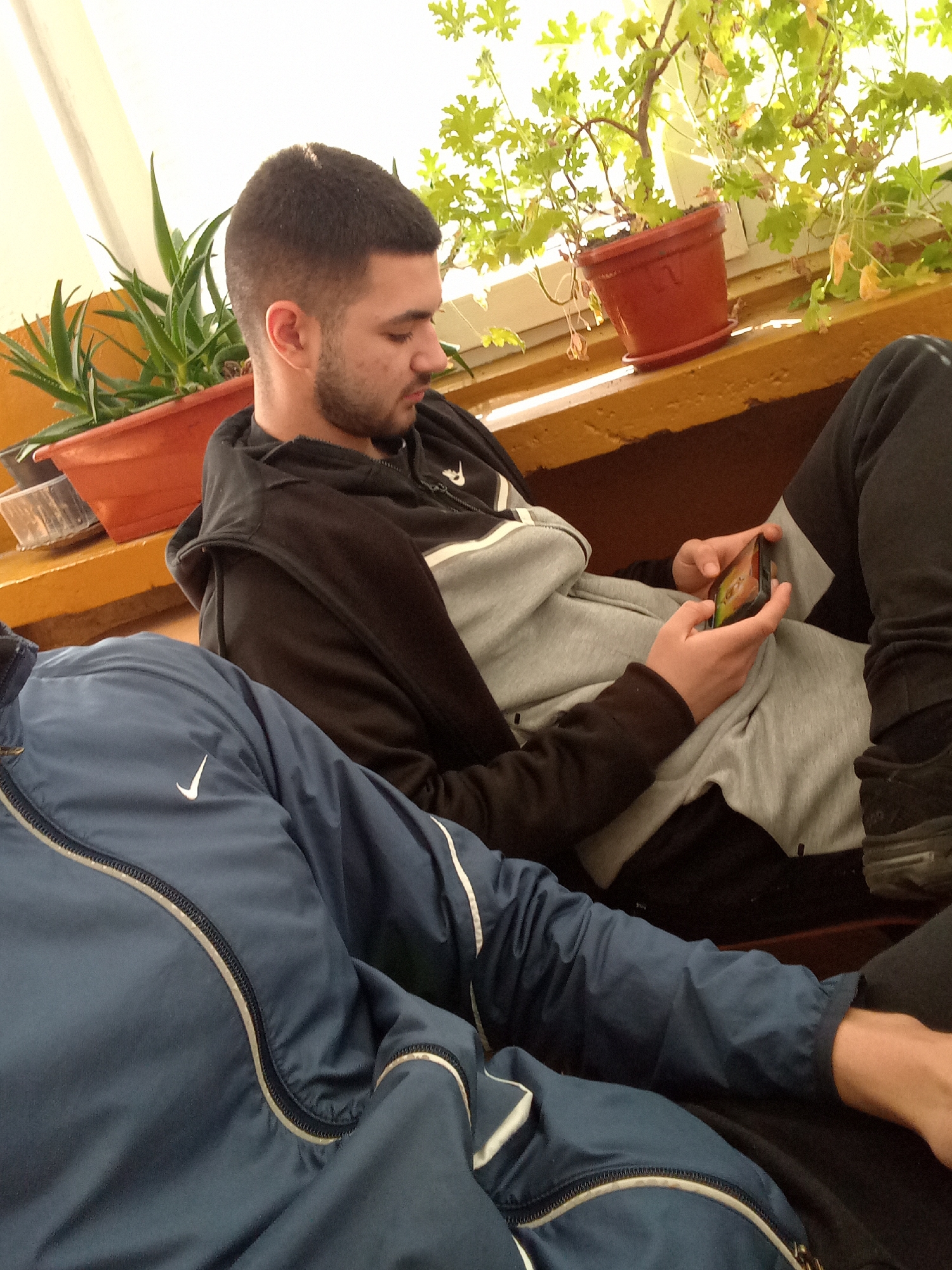 The image depicts two people sitting indoors. The first person is a young man with dark hair and a beard, wearing a black hooded jacket over a gray sweatshirt, and black pants. He is looking down at a mobile phone he is holding in his hands. The second person is wearing a blue Nike jacket and their arm and part of their leg are visible. Behind the people is a windowsill with plants in terracotta pots. The windowsill appears to be painted yellow. The location is Zlataritsa, Bulgaria.