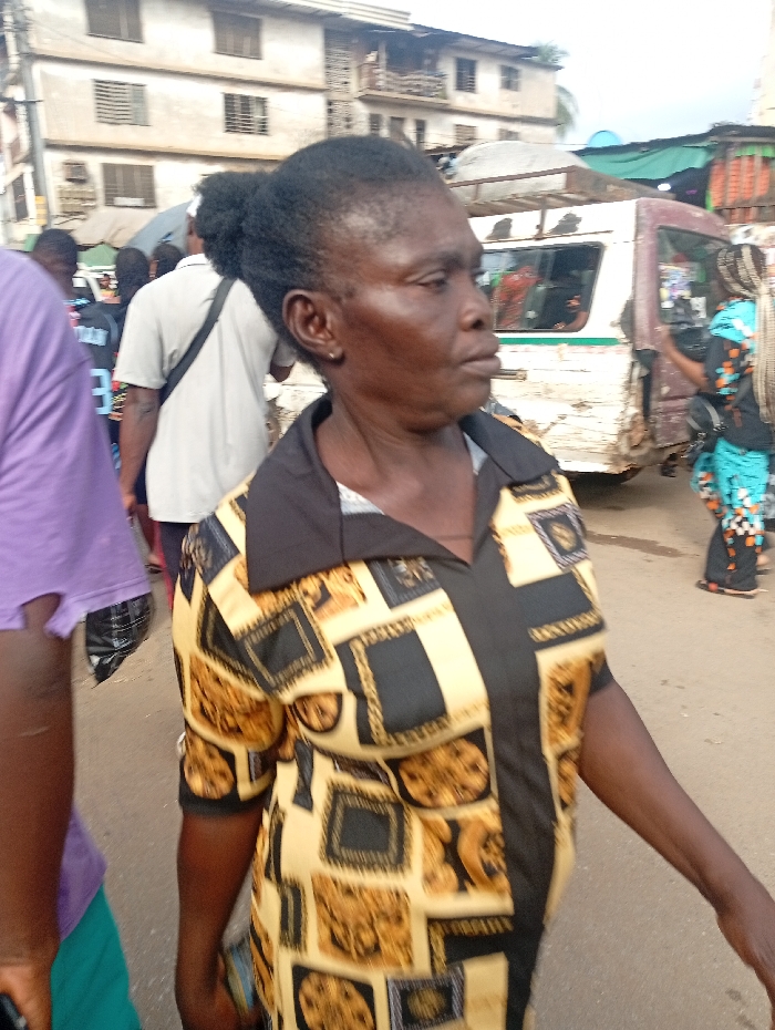 A street-level image captured in Onitsha, Nigeria, depicts a bustling urban scene. In the immediate foreground, a Black woman, appearing middle-aged, is shown in a three-quarter profile, looking towards the viewer's left. She wears a short-sleeved collared shirt featuring a black panel on the right side and a tan/cream section patterned with black and gold squares and abstract motifs. Her dark hair is pulled back into a bun, and a small stud earring is visible in her right ear. Behind her, to the left, the partial view of a person wearing a purple shirt is visible. Further back, another individual in a light grey shirt, seen from behind, walks with a dark strap across their shoulder. To the right, a person in a blue, black, and orange patterned dress stands near a stationary, weathered light-colored passenger van or bus. The van exhibits visible damage and has a roof rack; a green stripe is painted horizontally on its side. In the background, a multi-story concrete building with numerous windows and balconies rises, indicating a densely built environment. The ground appears to be a mix of paved and unpaved surfaces, consistent with a busy street or market area. The scene is illuminated by daylight.