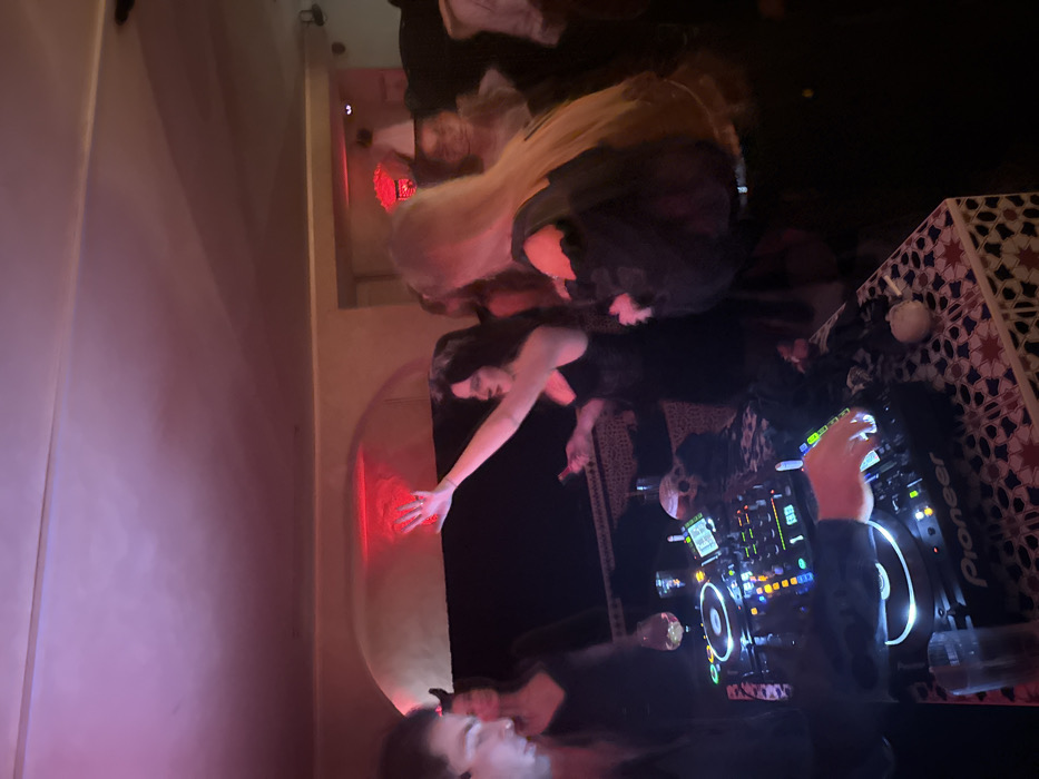 This image captures an indoor, dimly lit, red-hued scene identified as a nocturnal event in Paris, France. In the immediate foreground, the hands and torso of a male individual are visible, operating a professional Pioneer DJ setup with multiple illuminated controls and turntables. To his left, a glass containing amber liquid rests on the DJ console. Adjacent to the equipment, a decorative skull and a small white pumpkin-like object are placed on a table covered with a white cloth featuring a repeating red geometric pattern. In the mid-ground, a woman with long dark hair, wearing a black top and devil horns, is centrally positioned. She extends her left arm upwards with an open hand and holds a small red object in her right hand, appearing to be dancing or posing. To her right, another woman with long blonde hair, seen from behind, also wears a dark top and is partially visible. Further in the background, to the left of the central dancing woman, a third woman with dark hair and devil horns is visible, holding a drink. Other blurry figures are present in the deeper background, some possibly in costume, under warm red ambient lighting that casts shadows and highlights various architectural features, including an arched doorway. The overall atmosphere suggests a festive, possibly Halloween-themed, social gathering or club event.