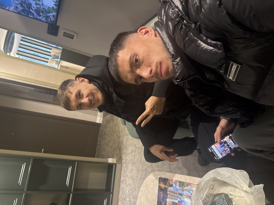 Two adult males are depicted indoors in what appears to be a modern hotel room or apartment in Istanbul, Turkey. The man in the foreground, identified as Artem Besedin, has short dark hair and light facial stubble. He is wearing a black, glossy puffer jacket with a "DSQUARED2" logo on the chest and dark trousers. He is holding a black smartphone in his left hand, oriented horizontally, with its screen displaying content that appears to be a social media feed or news article. His expression is neutral, and he is positioned as if taking a selfie. Behind him and slightly to the left, the second man, identified as Serhiy Buletsa, has short brown hair and is clean-shaven. He is wearing a black hooded jacket and dark trousers, seated on a light-colored upholstered chair or sofa. He is smiling faintly and extending his right hand, displaying a "peace" sign (V-sign) with his index and middle fingers. The immediate environment includes a light-colored coffee table to the left, featuring printed materials (possibly brochures or magazines with images of various locations) and a partially visible white plastic bag. In the background, to the far left, a dark green modular cabinet with light trim is visible. A dark brown door is situated behind the second man. To the right, a large wall-mounted television is displaying a vibrant, animated scene, possibly from a video game, featuring mountainous terrain and structures. A narrow reflective panel is also visible to the right of the door, reflecting vertical elements. The floor is covered with a light grey carpet.
