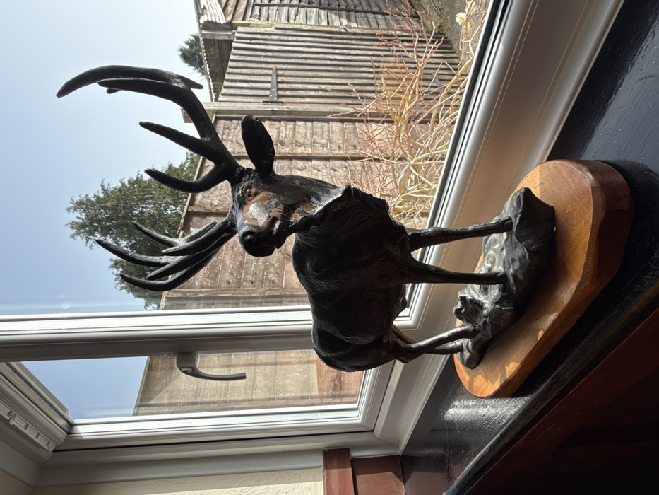 - "An indoor photograph displays a dark-colored statue of a male deer (stag) with prominent antlers, positioned on a black windowsill" by FM-H3TWA2, licensed under CC BY 4.0
