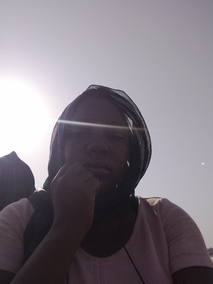 The scene depicts a single individual, appearing female, positioned outdoors in Ibi, Nigeria. The subject is captured from the chest up, silhouetted against a bright, overexposed sky, with strong direct sunlight originating from the upper left, causing significant lens flare across the subject's face. The individual wears a dark, sheer head covering. Facial features are obscured by shadow and glare. A light-colored, possibly pink or light brown, short-sleeved top with a visible texture is worn. The subject's right hand (viewer's left) is raised, with fingers curled and the knuckles resting near the chin or lower mouth area. A dark earbud cable is visible extending downwards from the subject's right side (viewer's left). To the far left, another indistinct, dark object is partially visible, also silhouetted against the bright sky. The environment is characterized by an open, outdoor setting with a clear, bright sky.