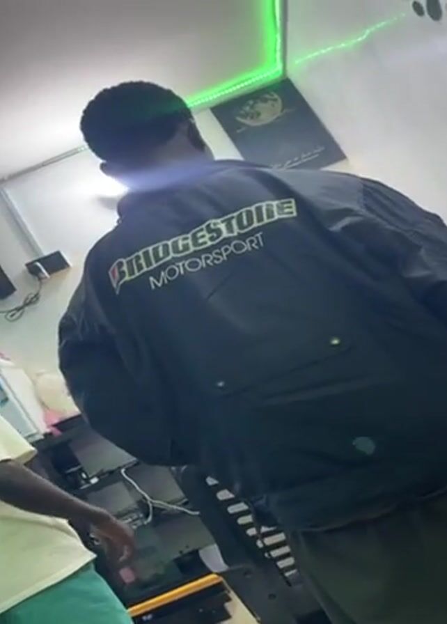In a brightly lit room, a man wearing a black Bridgestone Motorsport jacket stands with his back to the camera