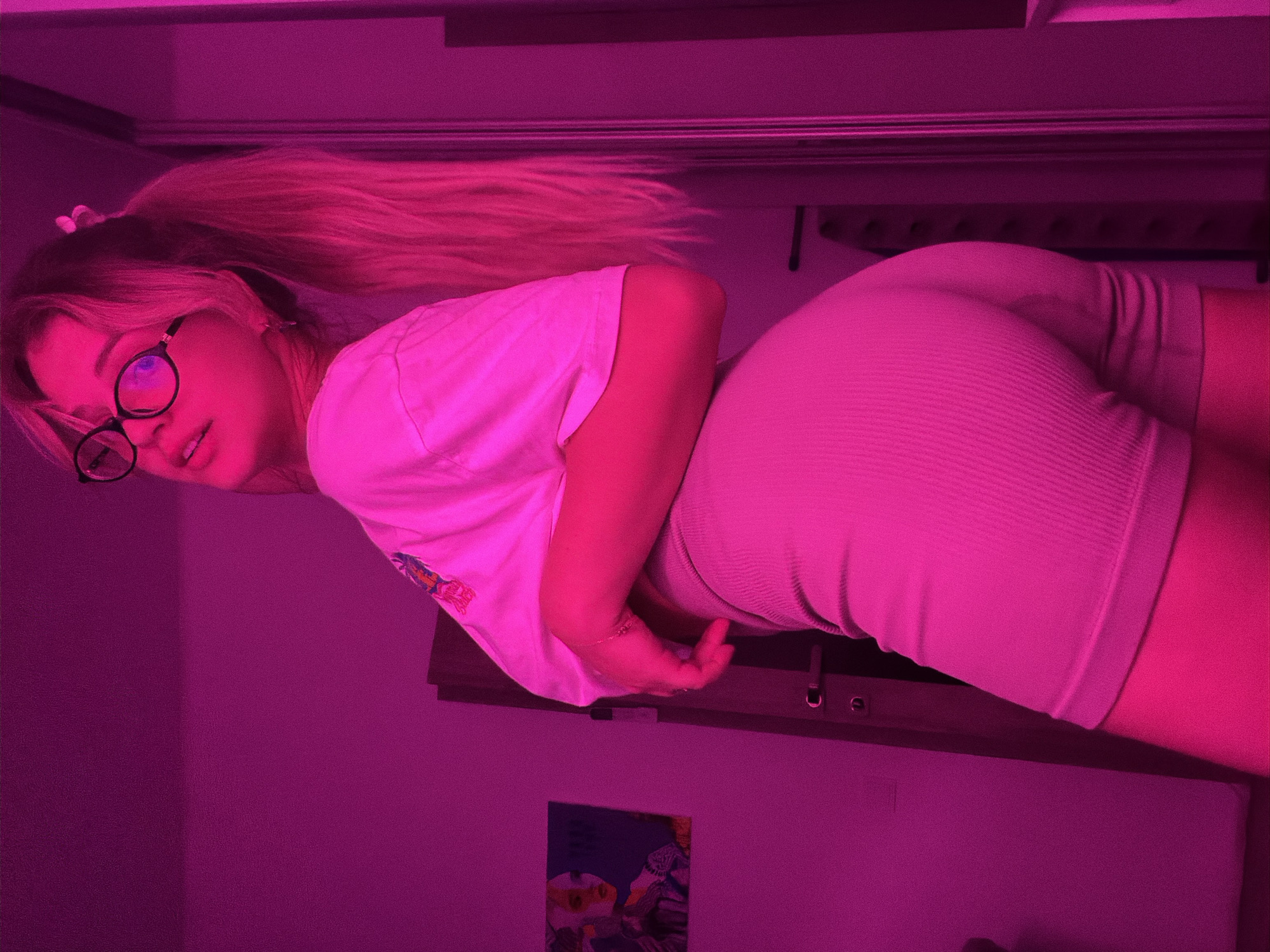 The image features a young woman with blonde hair in a ponytail, wearing glasses, a white t-shirt, and a pair of gray shorts. She is lying on a bed in a room illuminated with pink light. There is a picture on the wall and a cabinet beneath her. There are no details to confirm the location in the city of Bolshaya Shilna, Russia.