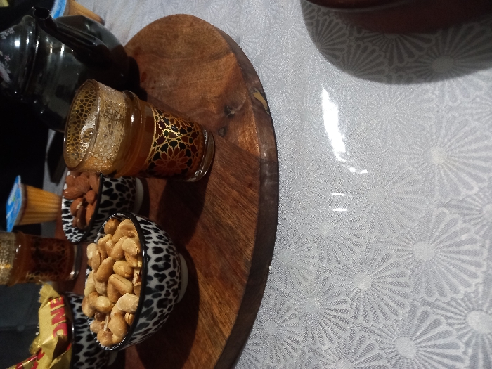 A circular wooden tray displays a collection of items. A dark-colored teapot rests at the top. A decorated glass cup filled with liquid sits beside it. Below, three small, leopard-print bowls contain almonds, cashews, and candy, respectively. The tray is placed on a white tablecloth with a floral pattern. A blurred object sits to the upper right of the tray.