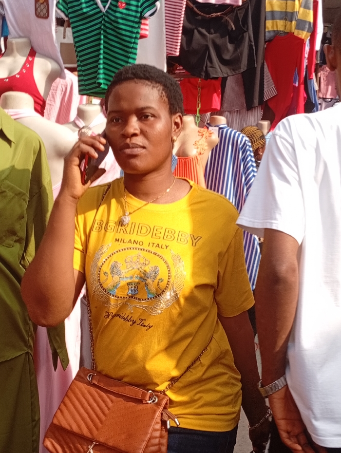 The image captures a daytime scene in the city of Fegge, Nigeria, likely within a market environment. A dark-skinned adult female, with short dark hair, occupies the central foreground. She is wearing a yellow short-sleeved t-shirt with the text "BGRIDEBBY MILANO ITALY" and a crest design, a gold-colored necklace, and a gold earring on her visible right ear. She holds a dark-colored smartphone to her right ear with her right hand, indicating she is engaged in a phone call. A brown quilted shoulder bag with a gold chain strap is worn across her body. To the right of the central figure, a partial view of another individual is visible, wearing a white t-shirt and a silver-colored wristwatch on their left wrist. The background features an array of various clothing items for sale, including striped tops, solid-colored shirts, and shorts, displayed on hangers and mannequins.