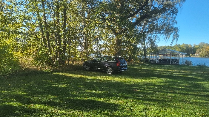 The image presents a static outdoor scene on a clear, sunny day, located at the waterfront area near Sjökrogen restaurant at Gränsö Slott in Västervik, Sweden. In the mid-ground, a dark-colored Volvo XC90 SUV is parked stationary on a well-maintained green lawn. The vehicle is positioned with its rear-left side visible, showcasing multi-spoke alloy wheels and roof rails. Behind the vehicle and to the left, a dense cluster of deciduous trees with green foliage forms a natural backdrop, partially obscuring the water beyond. A large, mature tree with a spreading canopy is prominent in the upper right quadrant of the image. A calm body of water, consistent with a bay or inlet, is visible extending across the mid-ground behind the trees and prominently on the right side. Directly situated over this water body, on the right side of the frame, is a white, multi-sided gazebo-like structure. This structure features a white roof supported by white pillars and is enclosed by white railings. Inside the gazebo, dark-colored tables and chairs are arranged. In the distant background, across the water, additional green foliage is visible along with a small white building featuring a distinct red roof, likely a house or cabin. The sky is clear and bright blue. Strong, direct sunlight illuminates the scene, casting pronounced shadows from the trees and the parked vehicle onto the grass in the foreground. No individuals are present in the image.