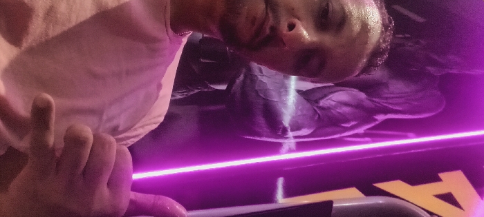 A man with a glistening forehead lies on his side, appearing sweaty. He wears a light pink shirt and his hand is in the foreground. The background shows an abstract image with a glowing white beam and what appears to be a shoe or boot. A vibrant pink light strip illuminates the scene, and yellow text is partially visible. The image is rotated.