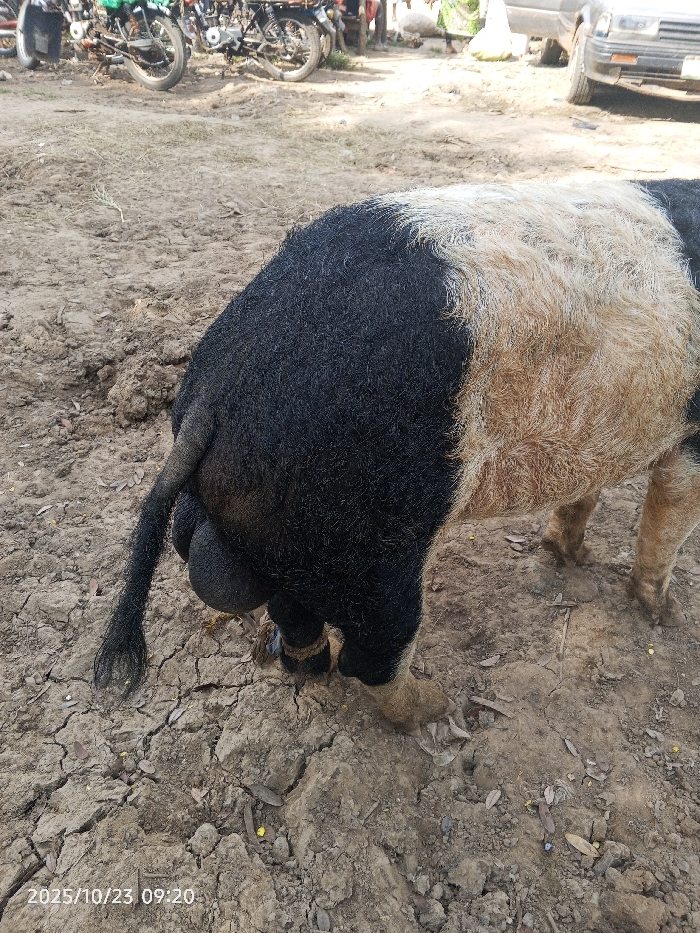 The image displays a bicolored pig (boar) standing on dry, cracked dirt in an outdoor setting in Unguwan Rimi, Nigeria. The pig, positioned with its rear facing the camera, exhibits distinct black fur on its hindquarters, tail, and hind legs, transitioning to coarse, light brown fur on its midsection and forepart. Prominent, pendulous testicles are visible beneath its tail. A dark, possibly fabric or rope, band is secured around the lower part of its left hind leg, just above the hoof. The ground is parched, with sparse debris. In the background, multiple motorcycles are parked on the left, while part of a light-colored vehicle (likely a sedan) is visible on the right. Distant, blurry human figures are also discernible. A timestamp "2025/10/23 09:20" is present in the lower-left corner.