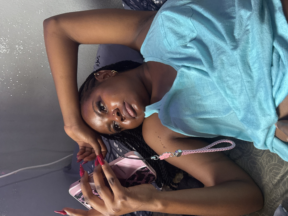 The scene depicts a female individual lying on a bed indoors, identified as a private residence in Asipa, Nigeria