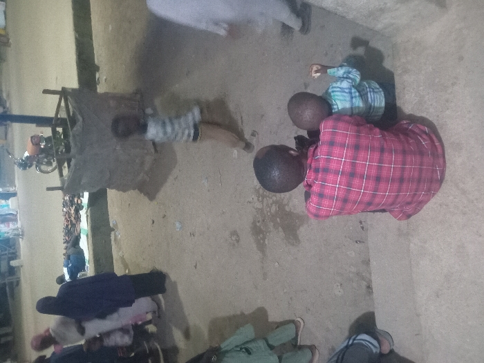 This image depicts an outdoor, low-light street scene in Bauchi, Nigeria, likely during the evening or night. In the immediate foreground, two individuals are seated on a concrete step with their backs to the camera. The larger individual wears a red and black plaid long-sleeved shirt. Seated to their right, a smaller individual wears a light blue and white plaid long-sleeved shirt and holds a light-colored object, possibly food, in their right hand. Moving into the mid-ground, a child wearing a horizontally striped shirt is in motion, walking rightward past a dark, cubic structure constructed from what appears to be wood or metal framing with opaque panels, possibly a bin or tree guard. Behind this structure, a red motorcycle is parked. To the left of the frame, a group of people stands on a dirt or unpaved surface, including one individual wearing a dark blue hijab and another in a light-colored long garment. Further left and slightly behind, a person is observed lying or sitting on the ground behind a display of dark-colored items, consistent with footwear such as sandals or slippers, arranged on a white sheet. The background is indistinct, showing additional blurry figures and suggesting a populated urban environment. The ground across the visible area is primarily unpaved earth or dirt. The scene is illuminated by unseen artificial light sources, casting soft, elongated shadows.