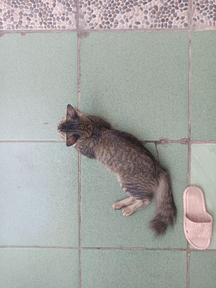 A domestic tabby cat is depicted lying on a tiled floor in Maleber, Indonesia
