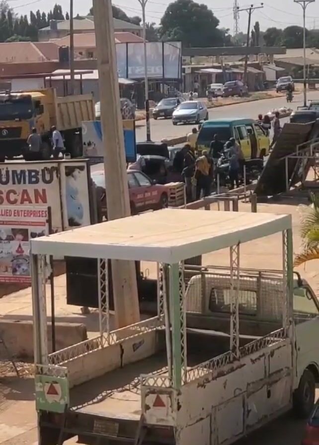 street scene in an urban area. A small white truck with a canopy stands in the foreground. In the background, there's a busy intersection with cars, motorcycles, and people gathered near a bus stop. There are buildings, signs, and utility poles lining the street. The weather appears sunny and clear.