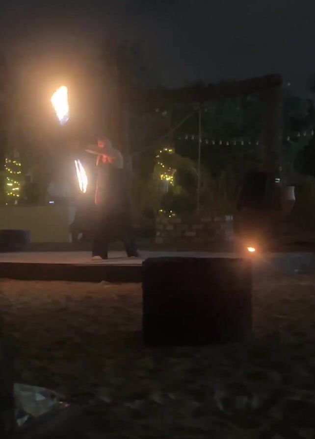 A person stands on a low platform on a sandy beach at night, performing with two hand-held torches. The torches are brightly lit and are a focal point of the scene. Behind the platform, there is a DJ booth and a partially visible wooden structure adorned with lights. Dark, square objects are placed in the foreground. The overall environment is dimly lit, creating a dramatic contrast with the flames.