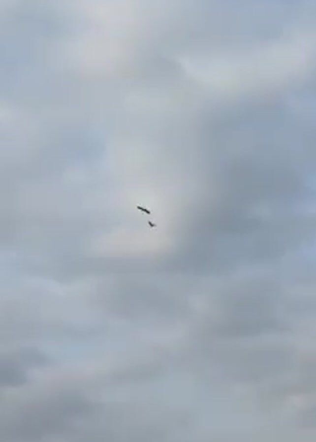 two birds flying in a cloudy sky