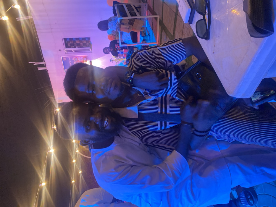Two men are posing for a picture. One man has a beard and is wearing a white shirt. He's smiling. The other man is wearing a striped shirt and has his hand over his mouth. Behind them are string lights, a white table with sunglasses and a black object on it, and other people in the background. The image is illuminated with blue and purple lighting.