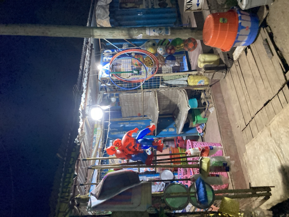 A narrow roadside shop exhibits various goods hanging from metal frames. These include colorful hula hoops, inflated Spiderman figures, and assorted balls. Plastic buckets, baskets, and cleaning brushes fill the shelves. The shop, illuminated by a bright light, appears cramped with an eclectic mix of household and toy items. A wooden plank structure forms part of the shop's exterior, and corrugated metal serves as roofing material.