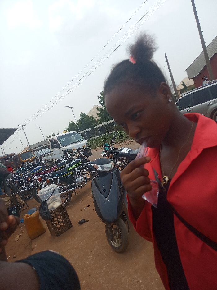 The image depicts an outdoor street scene in Nsugbe, Nigeria, under an overcast sky. In the foreground, slightly right of center, a person with dark skin is visible from the chest up, facing the camera with a direct gaze. This individual wears a red collared shirt over a black undergarment and a necklace with a dark and gold pendant. Their dark hair is pulled back, secured with a pink accessory forming a small ponytail. A white stud earring is present in the right ear. The person is in the process of consuming a clear liquid from a transparent plastic sachet, held to their mouth with their right hand. To the immediate left and slightly below the primary subject, a partial view of a second person's arm, clad in a dark sleeve, is visible, suggesting proximity to the camera. The midground and background reveal a busy commercial area. A black scooter is prominently positioned between the primary subject and a collection of parked motorcycles to the left. These motorcycles feature various designs, including some with green and yellow markings. Further back, a white cab-over-engine truck is parked. On the far right, a silver SUV is partially visible. Ground-level objects include a clear plastic bucket containing white items (possibly eggs) resting on a brown plastic crate, a yellow jerrycan or bag, and a single black shoe or sandal lying on the reddish-brown dirt ground. Multiple street lights equipped with solar panels extend into the background, beneath overhead power lines. Buildings are visible in the far background, including one with a red roof and a white sign bearing "NKEA" text. Green foliage is present between structures. The scene suggests an active public thoroughfare or market area.