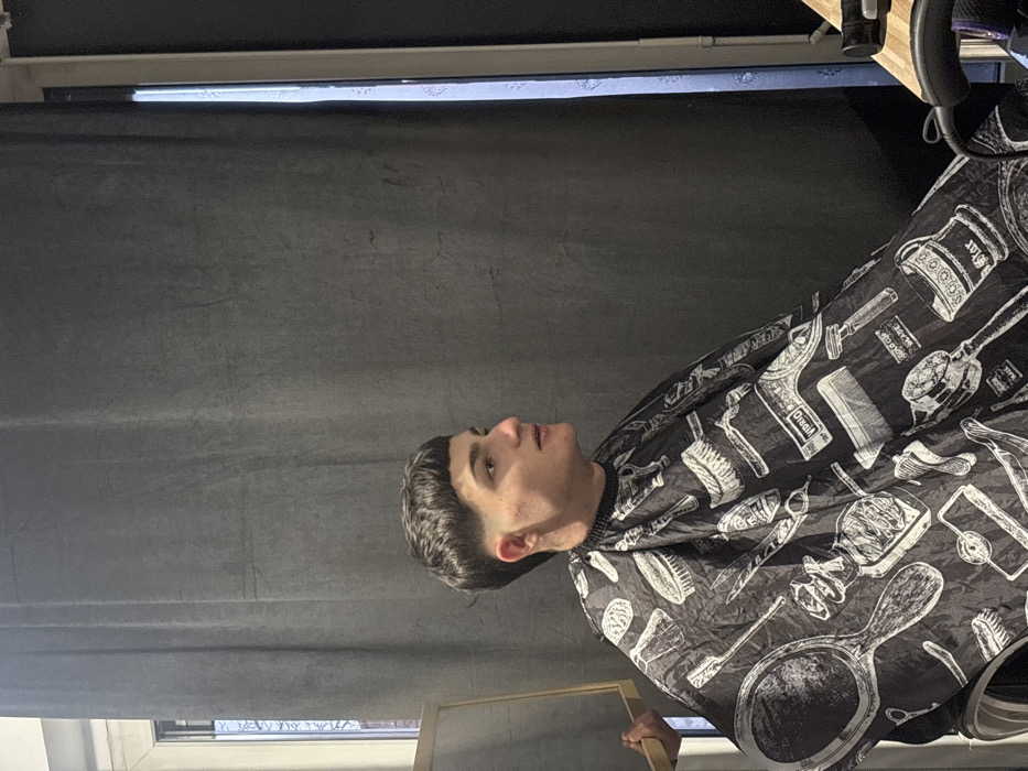 A young male is seated indoors, presumed to be in a barbershop in Ostwald, France