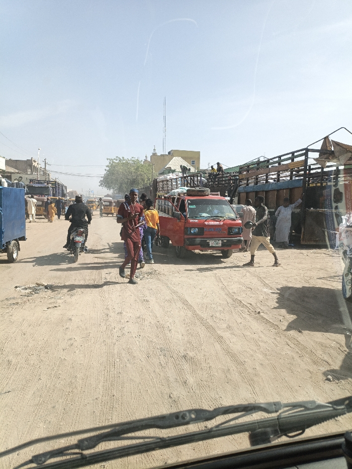 The image depicts a bustling market or commercial street in Fagge C, Nigeria, under a clear, bright sky. The foreground reveals the dashboard and wipers of a vehicle from which the photograph was taken, looking forward onto an unpaved, dusty dirt road with visible tire tracks. In the immediate mid-ground, a person dressed in a red traditional outfit walks directly towards the camera on the dirt road, holding items in their hands. Behind and slightly to their right, another individual in a yellow shirt stands near the open passenger door of a stationary red minivan. This minivan has a spare tire mounted on its roof and a partially visible license plate reading "KANO BX 827 DKN." To the left of the central figures, a person rides a black motorcycle away from the viewer. Further down the street on the left, several yellow three-wheeled vehicles (keke napep) are visible among other pedestrians. On the right side of the street, multiple large, open-back trucks are parked, heavily laden with numerous white sacks, suggesting commodity transport. Several individuals are actively engaged with these trucks, some appearing to load or unload cargo, including figures standing on top of the truck beds. Near the red minivan, a man in a dark shirt and light pants is visible, alongside another man in a light-colored garment who stands with his back partially turned, facing the trucks. In the background, a cluster of low-rise buildings with light-colored facades and various roof types line the street. A prominent structure with a dome or pointed roof is discernible in the distant center-left. A solitary green tree provides a point of contrast in the dusty environment. The scene is characterized by significant human activity and vehicular presence on an unpaved urban thoroughfare.