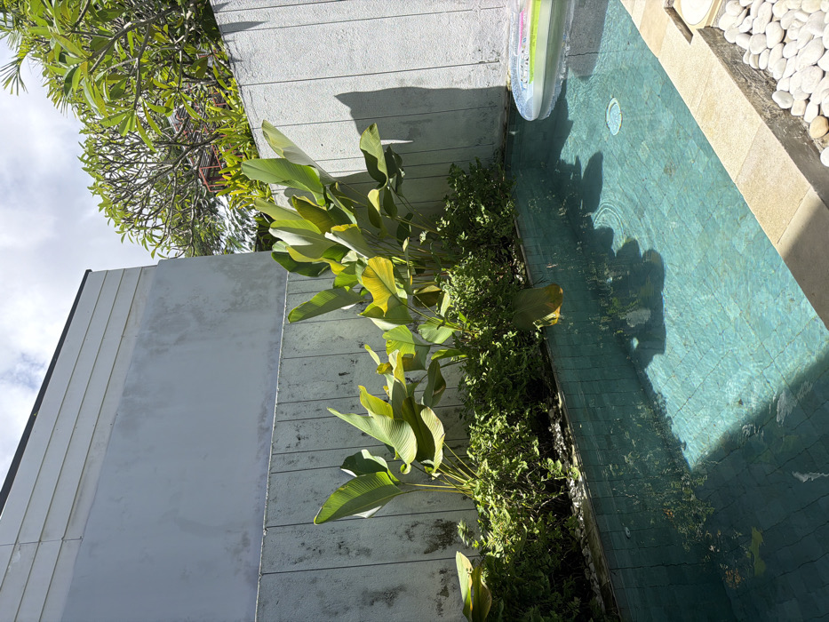 A poolside scene with a vertical orientation shows a building exterior with leafy plants growing alongside. The building has concrete panels, and a turquoise-colored pool borders it. Reflections play on the water's surface. White pebbles decorate the pool's edge. A green inflatable object floats in the pool. Lush green trees are visible above the building.