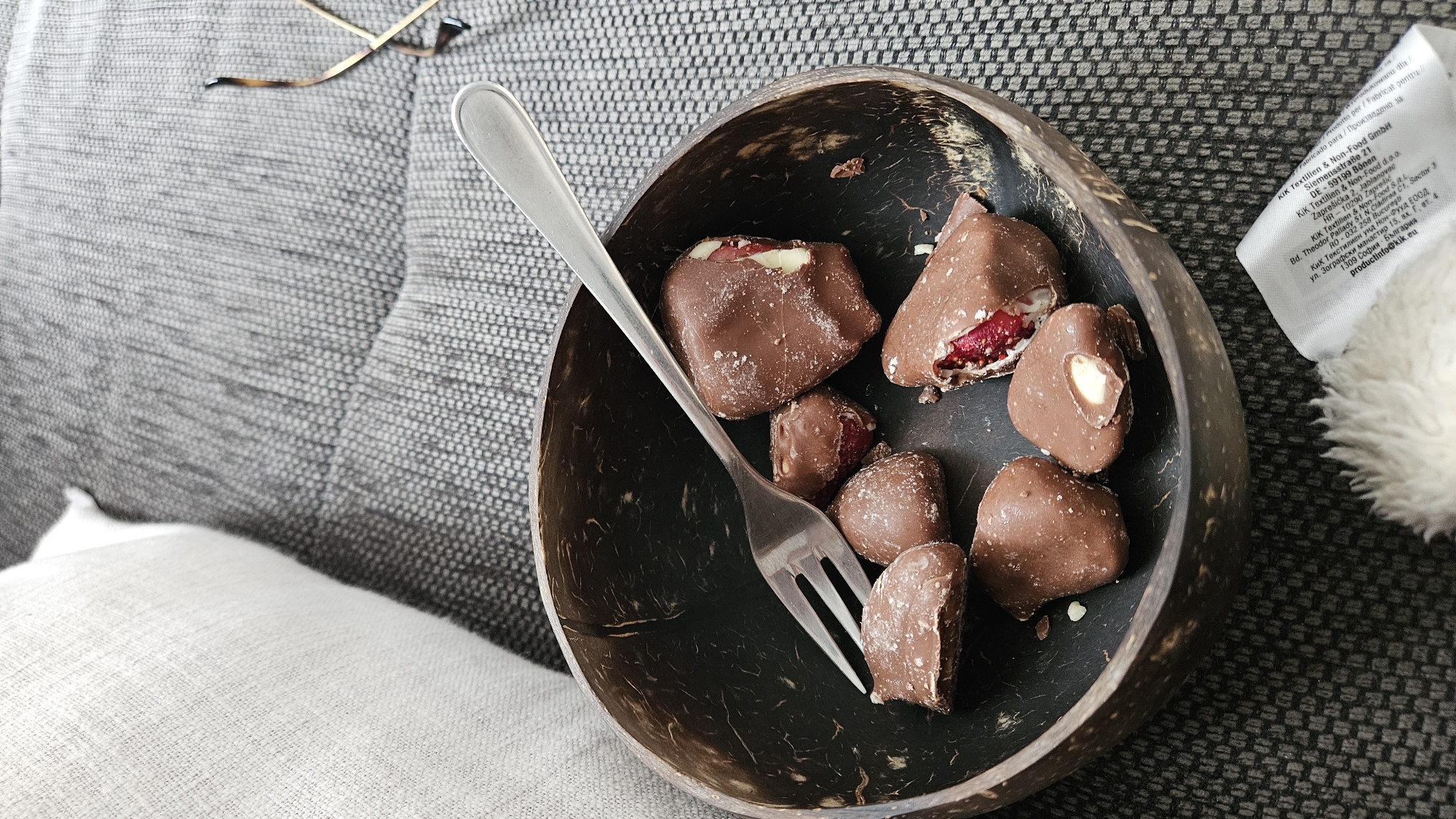 The image displays an indoor setting, likely a private residence in Nuremberg, Germany. A dark, irregularly shaped bowl, appearing to be crafted from a coconut shell, rests centrally on a dark grey, textured fabric surface, consistent with a sofa or armchair. Inside the bowl are approximately eight chocolate-coated confectioneries of various sizes and shapes. Some pieces reveal their fillings, including red dried fruit, likely cranberry or strawberry, and white almond fragments. A silver-colored, four-tined dessert fork lies diagonally within the bowl. To the upper left, a light grey fabric cushion or pillow is partially visible. In the upper right corner, a pair of eyeglasses with thin, gold-colored frames and dark earpieces is positioned on the grey fabric. The lower right foreground shows a white, fluffy object partially obscuring a white fabric product label. This label contains text identifying "KIK Textilien & Non-Food GmbH" and specifies an address: "Theodorstraße 4, 90409 Nürnberg, Germany," thereby establishing the location within Nuremberg. No individuals are visible; the scene suggests a paused or impending snack consumption in a casual domestic environment.