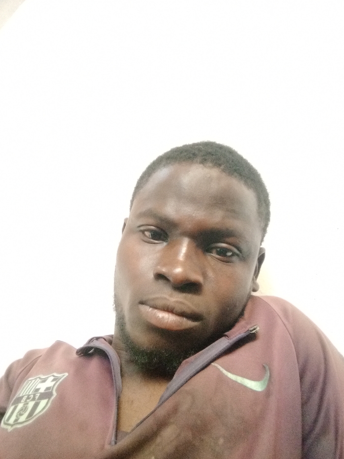 The image depicts a close-up, chest-up portrait of a dark-skinned male individual. He has short, dark hair and a short beard or stubble. The individual is looking directly at the camera with a neutral expression. He is wearing a dark reddish-brown athletic-style top, which is partially unzipped at the collar. On the left side of the garment (viewer's left), a crest resembling the FC Barcelona logo is visible. On the right side of the garment (viewer's right), a light-colored Nike "swoosh" logo is present. The background is a plain, uniformly light-colored surface, indicative of an indoor setting. This scene is located in Fagge A, Nigeria.