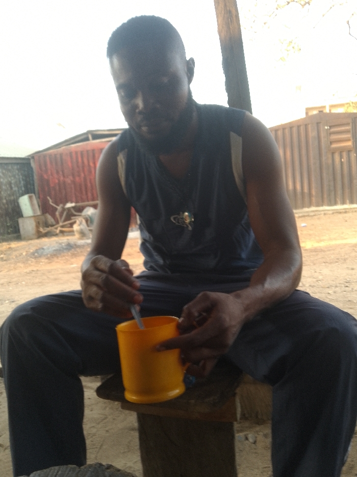 A male subject is depicted seated outdoors in an area identified as the city of Unknown, Unknown. He has dark skin, short dark hair, and a full beard. He wears a dark sleeveless top with light-colored shoulder trim, dark trousers, and a necklace featuring a silver-colored, possibly spherical, pendant. The subject is actively stirring the contents of a bright yellow plastic mug with a metallic spoon, while his left hand rests on the mug's side. He is seated on a simple wooden bench or block. The ground is composed of dirt or dust. In the background to the left, a corrugated metal barrier and a large red corrugated metal container are visible, along with scattered debris including white objects and tree branches. To the right, a structure made of vertical wooden planks with a rectangular opening is present, with a distant building hinted behind it. A wooden post extends vertically behind the subject's upper body.