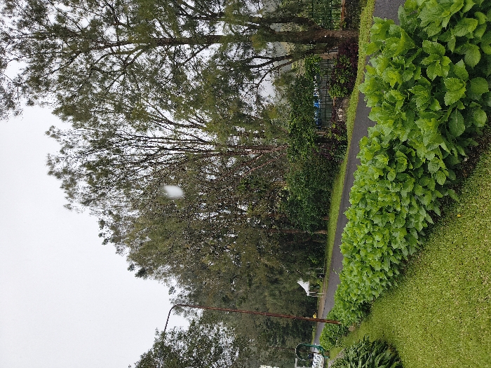 A slightly tilted view of a tree-lined path on a cloudy day. Tall trees dominate the left, their branches reaching towards the sky. Lush green bushes and grass border the path to the right. A lamppost is visible on the left, its thin metal frame contrasting with the foliage. A glimpse of buildings is visible in the distance, adding depth to the scene. The path seems to lead into the distance between a lawn.