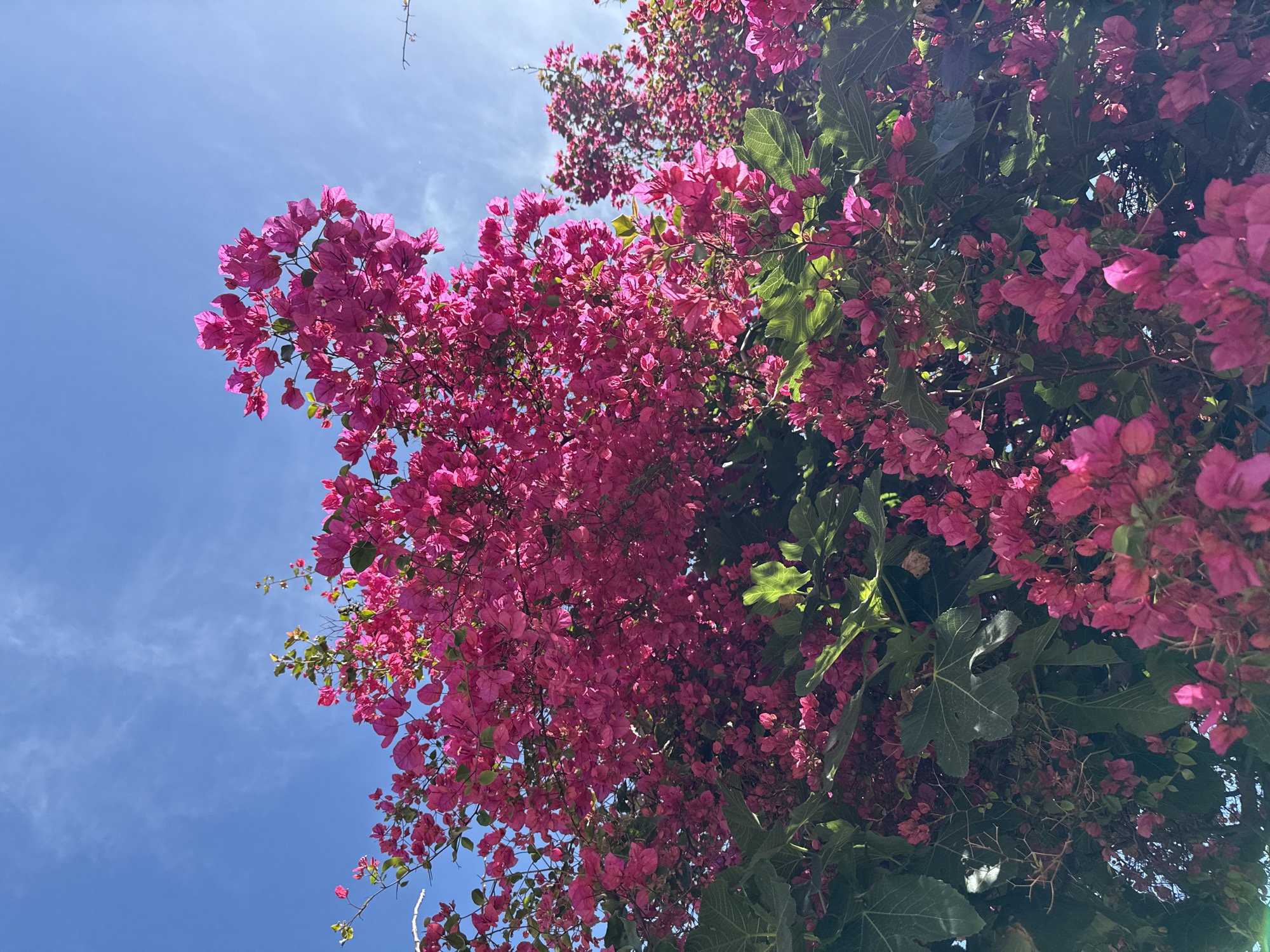 The scene, located in Tel-Aviv, Israel, features a dense proliferation of bright fuchsia bougainvillea bracts and green foliage, observed from a low-angle perspective against a clear blue sky. Numerous large, multi-lobed fig leaves with prominent venation are interspersed within the lower and mid-sections of the bougainvillea, identifiable by their distinct shape and darker green hue. The upper portion of the frame is dominated by the unobstructed blue sky with minimal, thin white cirrus clouds visible. Direct sunlight illuminates the plant from above and slightly to the right, creating areas of intense brightness and translucence on the bougainvillea bracts and the surfaces of the leaves. No human subjects, animals, or artificial structures are discernible.