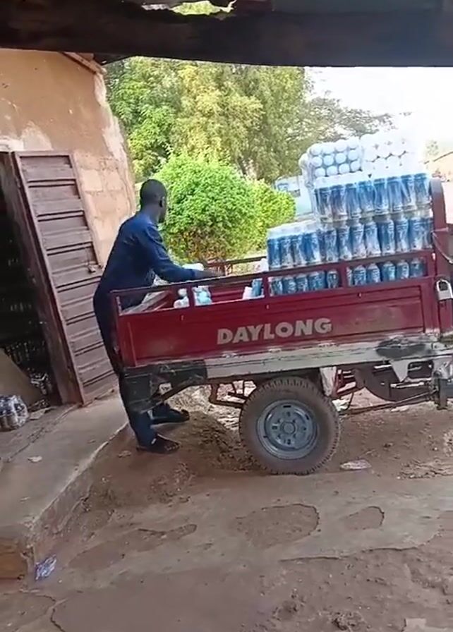 A man is loading stacked cases of canned beverages onto a small red utility vehicle marked "DAYLONG." The vehicle, which appears to be a three-wheeled cart, is parked under the overhang of a simple building with a wooden door partially ajar. Another person walks by carrying an additional case of the canned beverage. The area around the vehicle is a dirt ground. The environment is semi-rural with trees visible in the background.