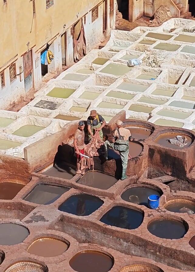Captured from an elevated perspective, the video displays three men actively engaged in the tanning process at what appears to be a traditional tannery
