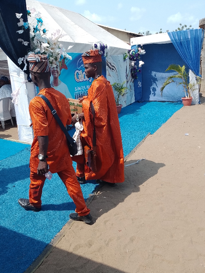 The image depicts an outdoor event setting during daytime, likely in Maroko, Lagos, Nigeria, indicated by legible text on a background banner. The foreground shows two adult males in traditional Nigerian attire. The man on the left, with his back partially turned, wears an orange short-sleeved tunic and matching trousers, a striped patterned cap, black shoes, a black crossbody bag, and a silver wristwatch on his left wrist. He holds a crumpled light-colored object in his right hand and appears to be walking from right to left across a bright blue textured ground covering. The man on the right, facing left in profile, wears a longer, flowing orange traditional garment over trousers, a matching patterned cap, and black shoes. He carries a brown leather satchel over his left shoulder and is standing. In the midground, a white canopy tent is visible, decorated with dark blue and white fabric drapes and artificial floral arrangements incorporating white and blue flowers and white butterfly cutouts. A large blue banner, positioned against a decorated wall segment, features the text "Capt Glory," "S/M/L/ PA," and "MAROBA," along with a smiling photographic portrait of an individual. Potted green plants, resembling small palms, are placed as decorative elements around the blue textured flooring. The ground in the immediate right foreground consists of dry, sandy earth, where distinct shadows are cast, indicating bright sunlight from the upper left. A third, indistinct person in white attire is partially visible seated under the tent to the far left.