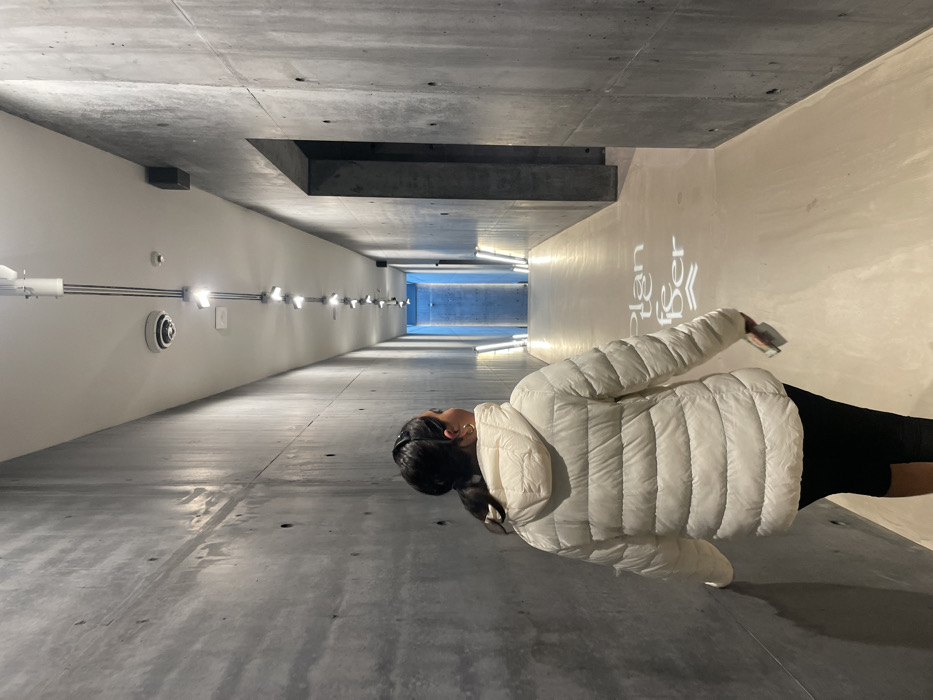 A woman is depicted walking away from the camera down a minimalist concrete corridor. She is positioned slightly right of center, her back to the viewer, and her left shoulder turned slightly forward. She wears an off-white quilted puffer jacket with a hood and dark-colored leggings. Her dark hair is pulled back, secured by a white scrunchie. A small gold hoop earring is visible on her left ear. Her left hand is near the concrete wall. In her right hand, she holds a small, rectangular object, possibly a phone or card, displaying a partial green color. The corridor is characterized by raw, exposed concrete walls with visible formwork lines and tie holes. The ceiling is white, featuring a track lighting system with multiple individual spotlights illuminating the path. A white dome-shaped security camera and a small red indicator are mounted on the ceiling in the foreground. The floor is a light-colored, smooth surface. White text, partially visible as "Plan to ser" with two upward arrows, is projected onto the floor as directional signage further down the hallway. Approximately midway down the right wall, a dark, rectangular entryway or recess is visible. The far end of the corridor opens into an area intensely illuminated by blue light, flanked by two vertical, bright light fixtures. The scene is located in a modern architectural setting within Klampenborg, Denmark.