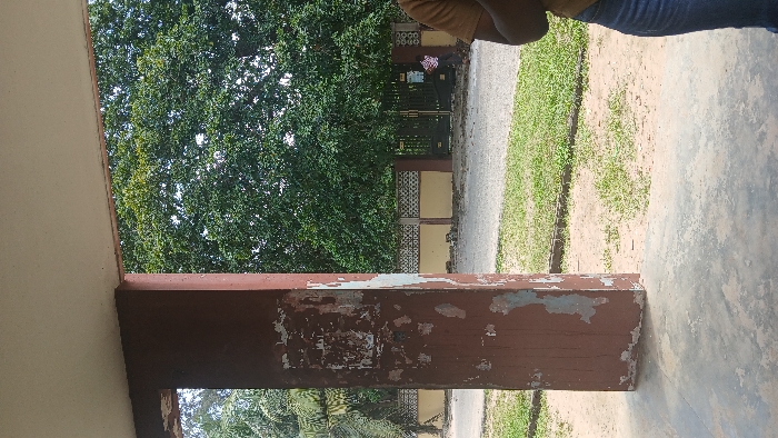 The image depicts an outdoor scene in Ojo, Nigeria. In the immediate foreground, a weathered, reddish-brown structural pillar with significant peeling paint and faded paper remnants is visible on the left, supporting a light-colored ceiling overhang. To the right, the lower torso and arm of a person wearing a brown shirt and blue jeans are partially visible. The ground consists of a concrete slab underfoot, transitioning to a strip of sparse green grass and bare dirt, then a dirt road. Across the dirt road, a low boundary wall, yellow with brown accents and decorative concrete block patterns, extends horizontally. A dark metal gate is integrated into this wall on the right. Behind the gate, a person in a plaid shirt is partially visible. The background is dominated by dense green foliage from large trees, with additional palm-like trees visible on the far left. Scattered debris is present on the ground in front of the wall.