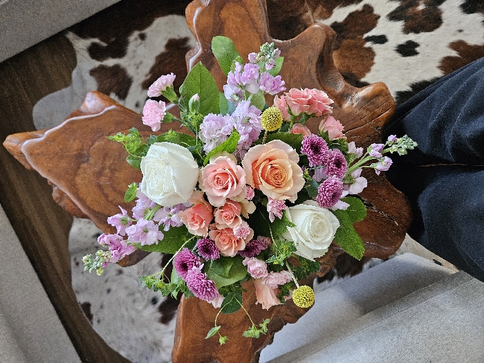 A floral arrangement is positioned centrally on an irregularly shaped, polished dark wood table. The arrangement consists of white, peach, and pink roses, deep purple chrysanthemum-type flowers, light purple stock flowers, small yellow craspedia, and various green foliage. The table exhibits a natural, live-edge design with a prominent wood grain. Beneath the table, a brown and white patterned cowhide rug is visible on the floor. A dark fabric, likely an article of clothing, is partially visible along the top edge of the frame. A light-colored upholstered furniture item, such as a sofa or chair armrest, is present along the right and bottom edges of the frame. The scene is set indoors, indicative of a residential or commercial interior. The specific location within Los Angeles, United States of America, cannot be determined from the visual evidence provided.