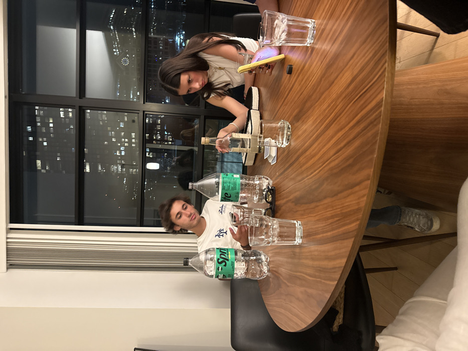 The image depicts an indoor scene at night, presumably within a high-rise building in Boston, Massachusetts, United States, offering a panoramic view of the city skyline through large, multi-pane windows. The distant skyline features numerous illuminated skyscrapers and a distinct building with a curved roofline visible on the right. In the foreground, a young male with wavy brown hair, wearing a white long-sleeved shirt with a "NY" logo and blue jeans, sits on the left, holding and looking down at a smartphone. Beside him, a young female with long dark hair, wearing a light-colored sleeveless top and a thin gold necklace, holds and looks down at a yellow-cased smartphone. They are seated at a large, round, dark wood grain table with a central pedestal base. On the table are two large plastic Sprite bottles, at least four clear drinking glasses (some containing water), a clear glass bottle with a cork stopper and clear liquid, a stack of white rectangular cards, a pair of dark sunglasses, and a small black circular object. A black bag or clutch is also visible near the female's left hand. The room has light-colored walls and is illuminated by internal light sources, casting reflections on the window glass.